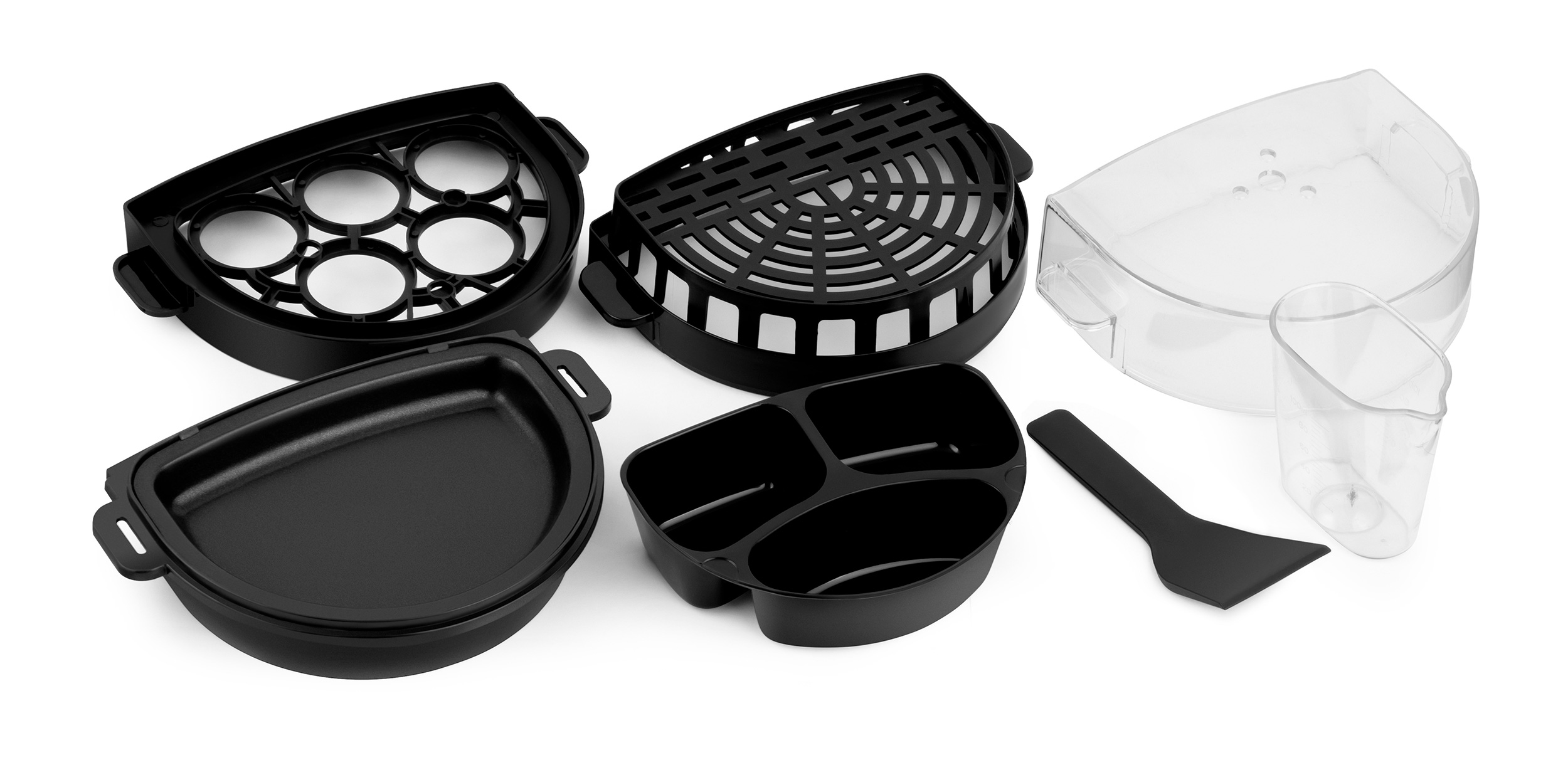 В комплекте: поддон для сбора крошек, лоток для варки яиц, лоток для приготовления на пару, лоток для яичницы, мерный стаканчик